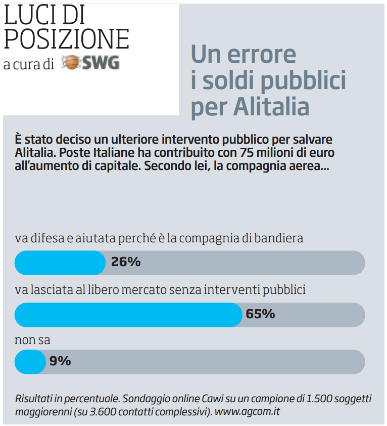 Sondaggio Swg: i cittadini si mostrano diffidenti verso nuovi tentativi di "salvataggio" per Alitalia; solo il 26% degli italiani approverebbe interventi a favore della compagnia di bandiera.