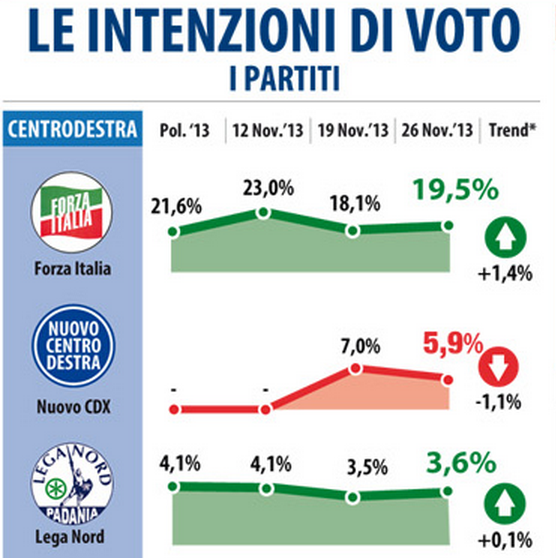 Sondaggio Ispo: In calo PD, Scelta Civica e Lega. Forte crescita delle piccole formazioni politiche. Il CdN di Alfano supera il 10%. balzo in avanti del Centrodestra, che ottiene tre punti di vantaggio sul Centrosinistra.
